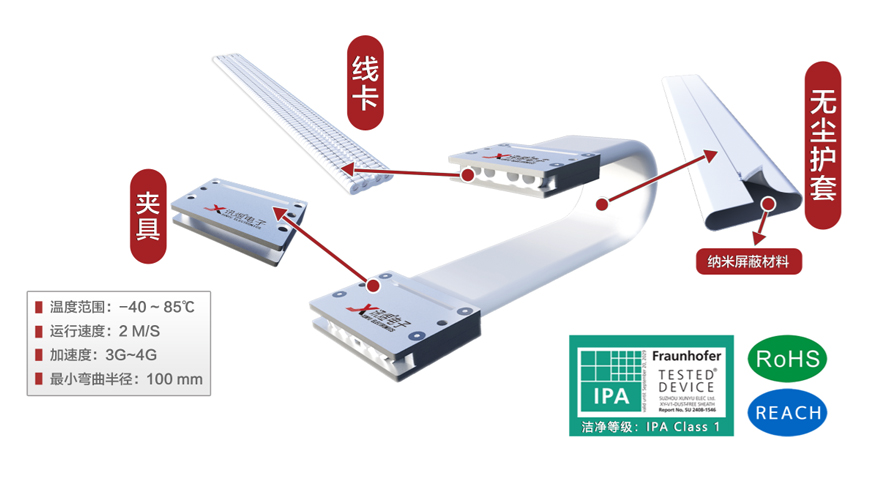 訊煜開放易安裝式無塵拖鏈(第3代屏蔽款無塵拖鏈)是一種滿足無塵環(huán)境下線纜防護(hù)及運(yùn)動(dòng)需求的產(chǎn)品,拖鏈自帶屏蔽抗干擾功能(內(nèi)層采用納米屏蔽材料,吸收拖鏈內(nèi)部線纜EMI竄擾)。易安裝式優(yōu)于封閉式拖鏈結(jié)構(gòu),外層護(hù)套采用拉鏈開口式結(jié)構(gòu),便于線纜的安裝和更換。中間線纜由柔性線卡分隔和固定,提高線纜排布的速度和美觀度,同時(shí)減少線纜絕緣層的磨損,延長線纜的使用壽命。支持多層疊加,支持龍骨支撐,滿足長行程應(yīng)用場景。