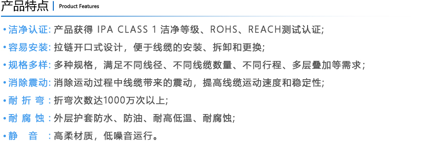 易安裝式優(yōu)于封閉式拖鏈結(jié)構(gòu),外層護套采用拉鏈開口式結(jié)構(gòu),便于線纜的安裝和更換。中間線纜由柔性線卡分隔和固定,提高線纜排布的速度和美觀度,同時減少線纜絕緣層的磨損,延長線纜的使用壽命。支持多層疊加,支持龍骨支撐,滿足長行程應(yīng)用場景。